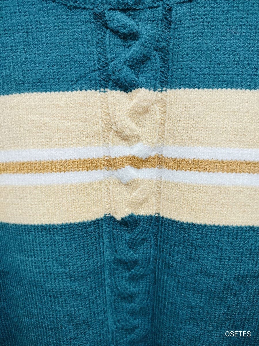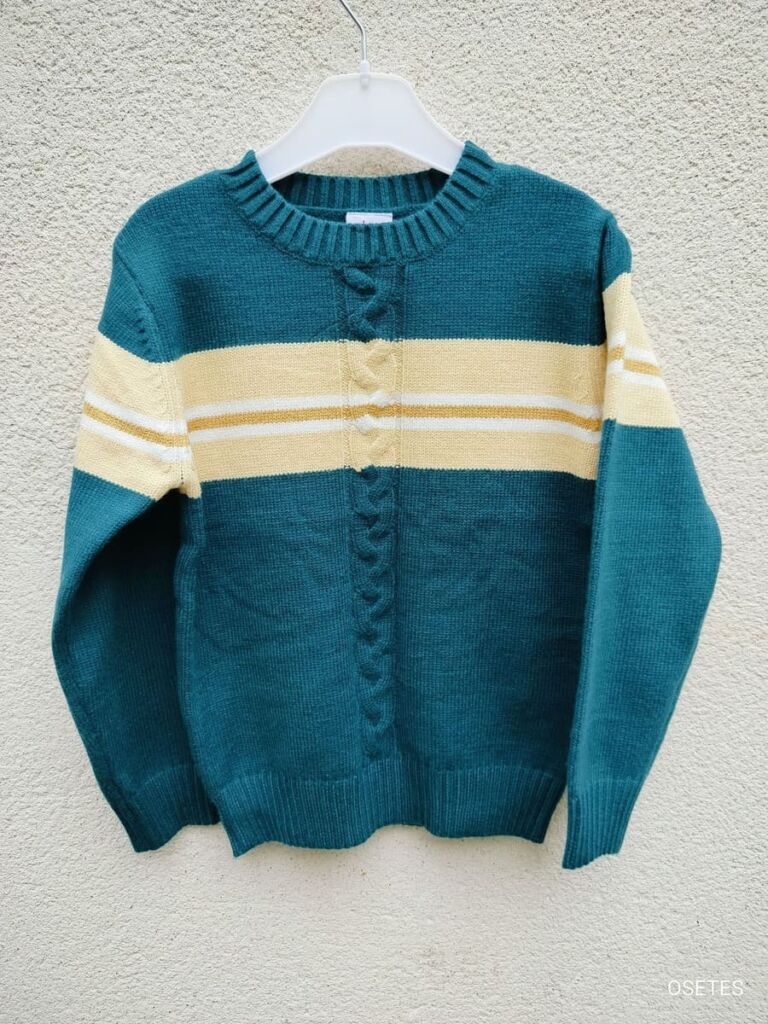 Jersey de punto suave y cálido, ideal para los días más frescos. Su diseño en color verde petróleo con franja central en tono beige aporta un aire moderno y juvenil, fácil de combinar con cualquier look.