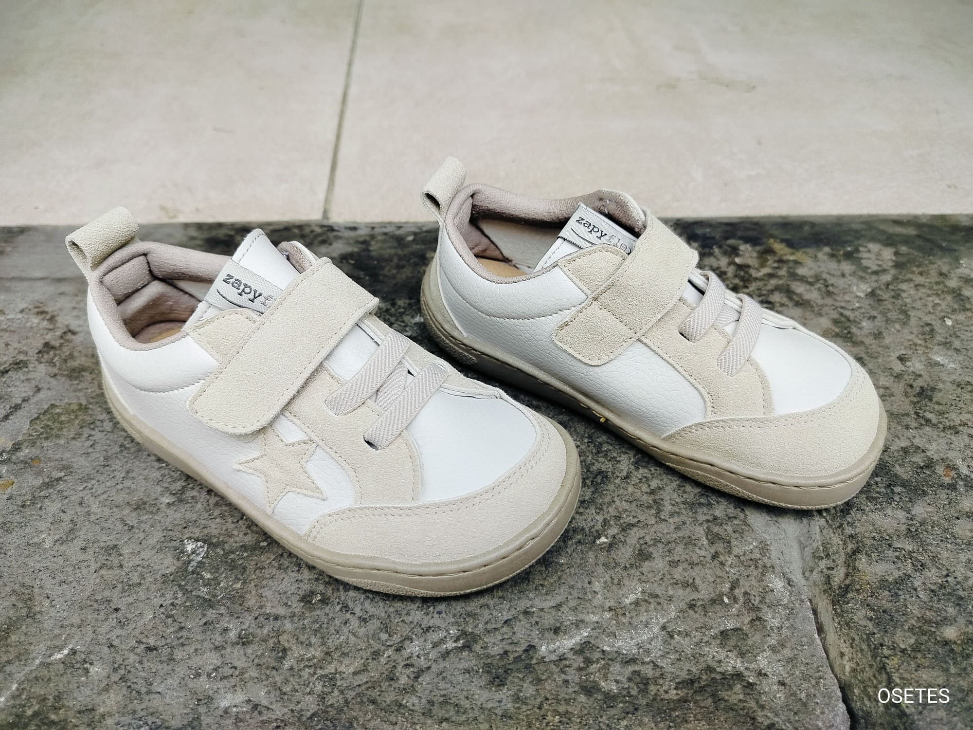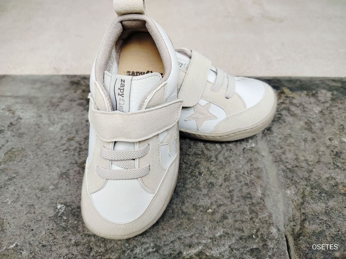 Calzado respetuoso infantil de la marca Zapy. Modelo en color blanco combinado con beige en serraje, con detalle lateral de estrella. Fabricado en materiales flexibles y transpirables. Suela fina y antideslizante que favorece el movimiento natural del pie. Cierre de velcro para un ajuste cómodo y sencillo y plantilla extraible.