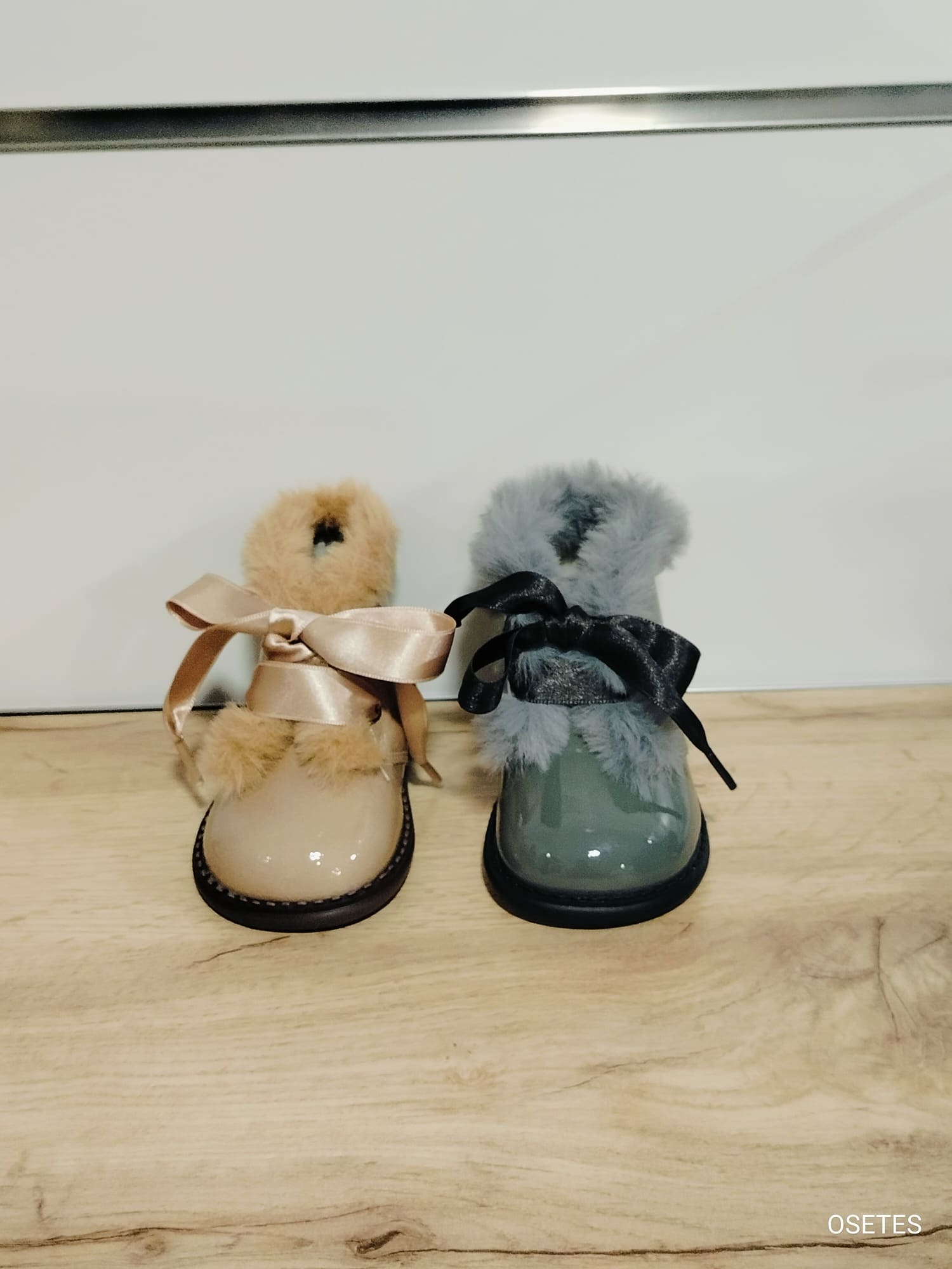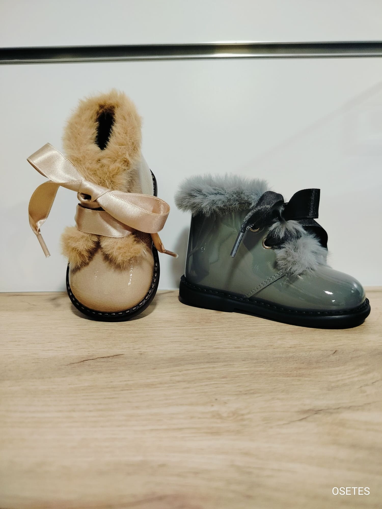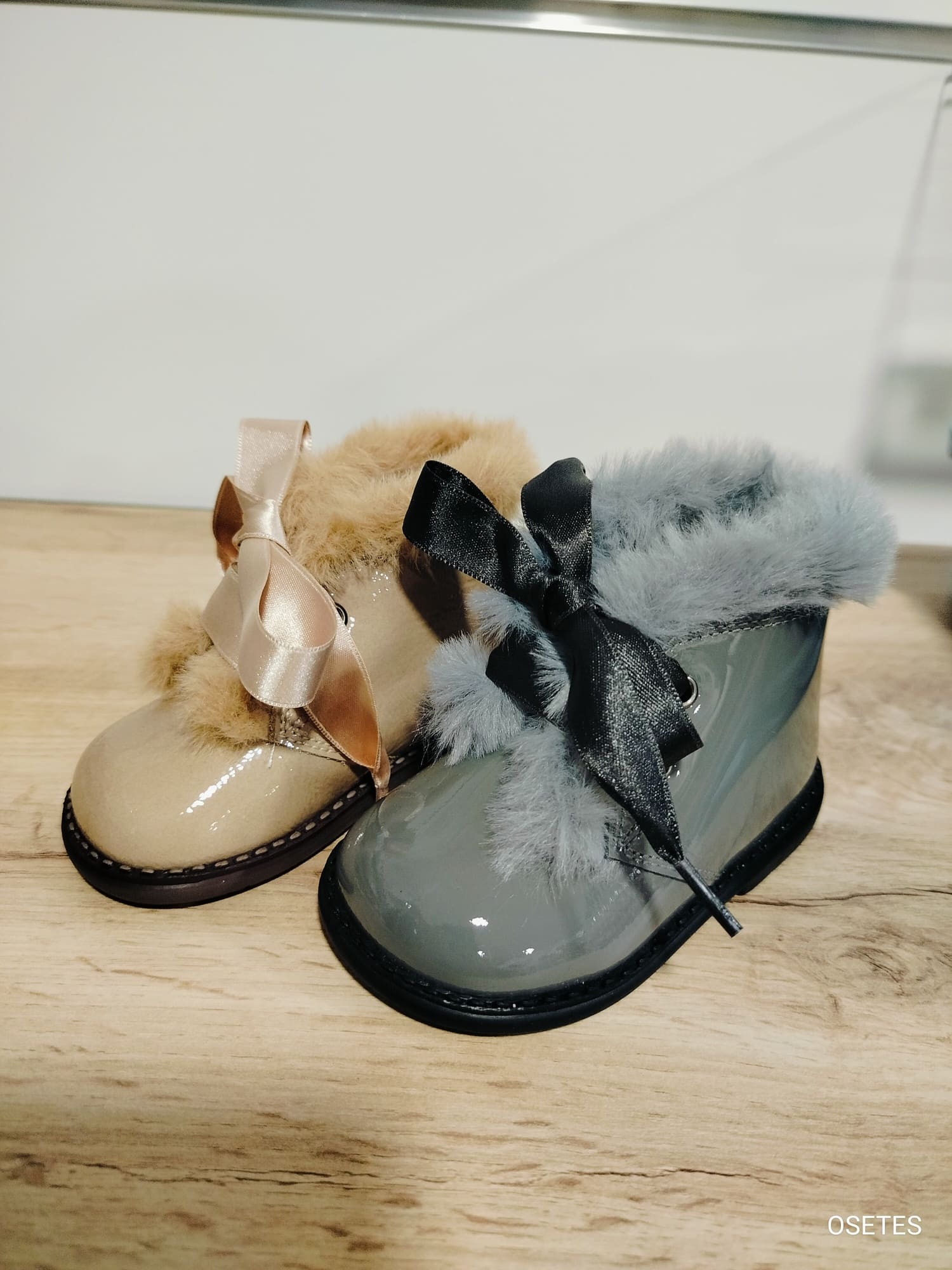 Botitas de charol de Andanines disponibles en gris o beige, con un elegante lazo de raso que se puede intercambiar por cordones normales para adaptar el estilo en cada ocasión. Cuentan con un suave detalle de pelito en el reborde, en el mismo tono que el charol, que aporta calidez y un aire muy dulce. Un modelo pensado para las más pequeñitas, cómodo y coqueto, ideal para ocasiones especiales o para dar un toque sofisticado a los looks del día a día.