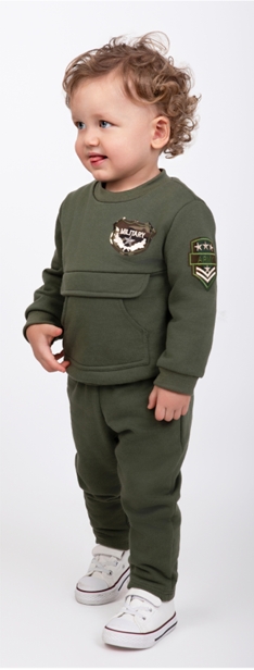 Chándal para bebé niño de la marca Nekenia, colección otoño invierno. Conjunto de dos piezas en tejido afelpado verde militar, cálido y confortable. La sudadera de manga larga incluye bolsillo canguro delantero, práctico y con estilo moderno. El pantalón a juego cuenta con cintura elástica para mayor comodidad. Un conjunto perfecto para el día a día, manteniendo al bebé abrigado y con libertad de movimiento.
