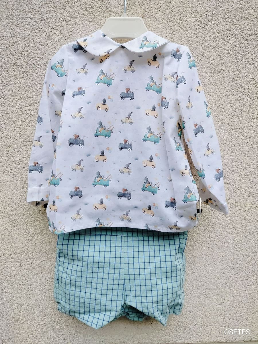 Este conjunto infantil combina la comodidad del algodón 100% con un diseño clásico y actual. La camisa blanca con estampado de animalitos en coches resulta fresca y divertida, mientras que el cuello bebé liso aporta un toque elegante.