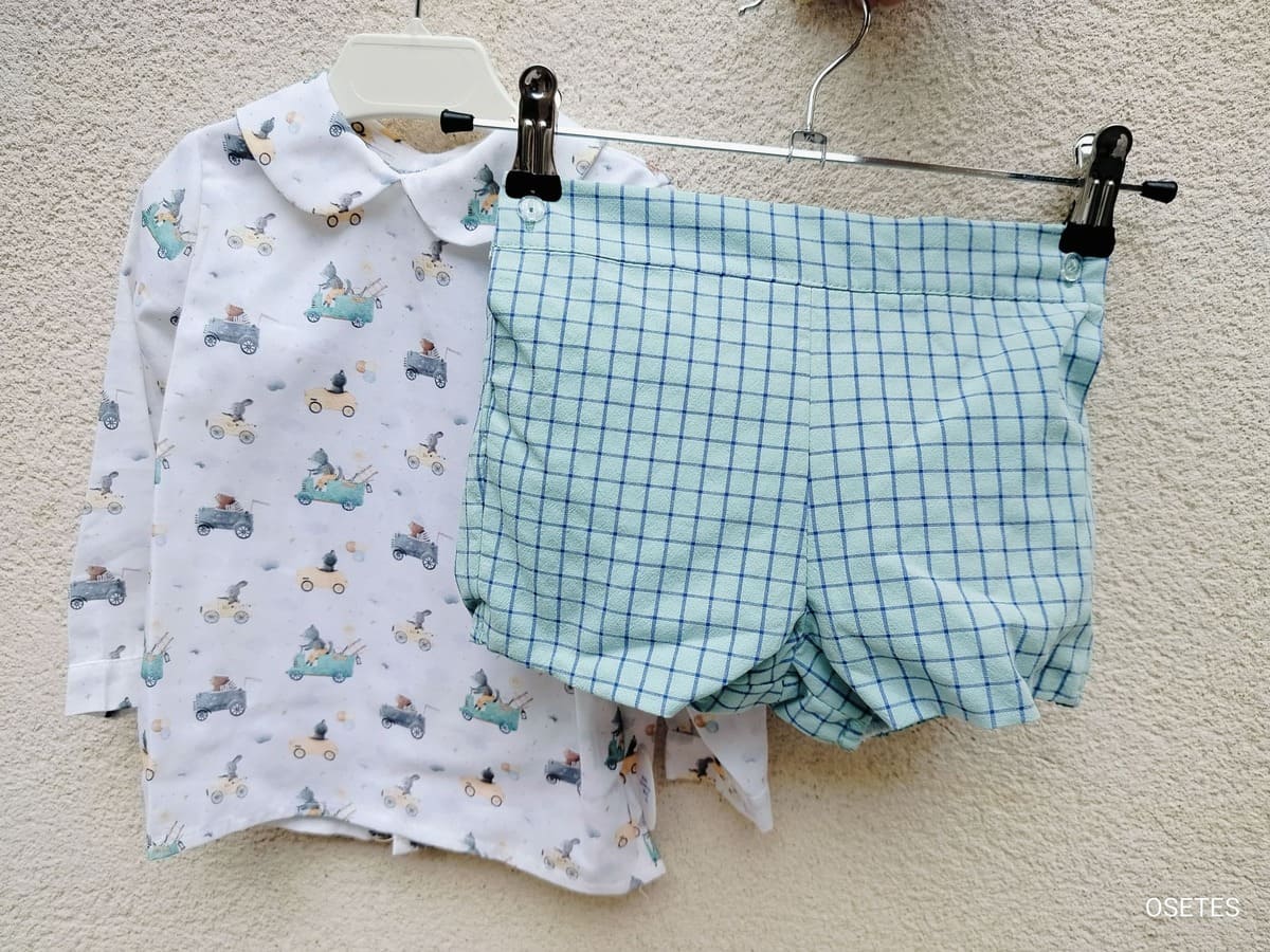 El conjunto se completa con un pantalón corto en cuadro vichy verde menta, coordinado con los detalles de la camisa para un look equilibrado y encantador. Ideal para ocasiones especiales o para vestir a diario con estilo.