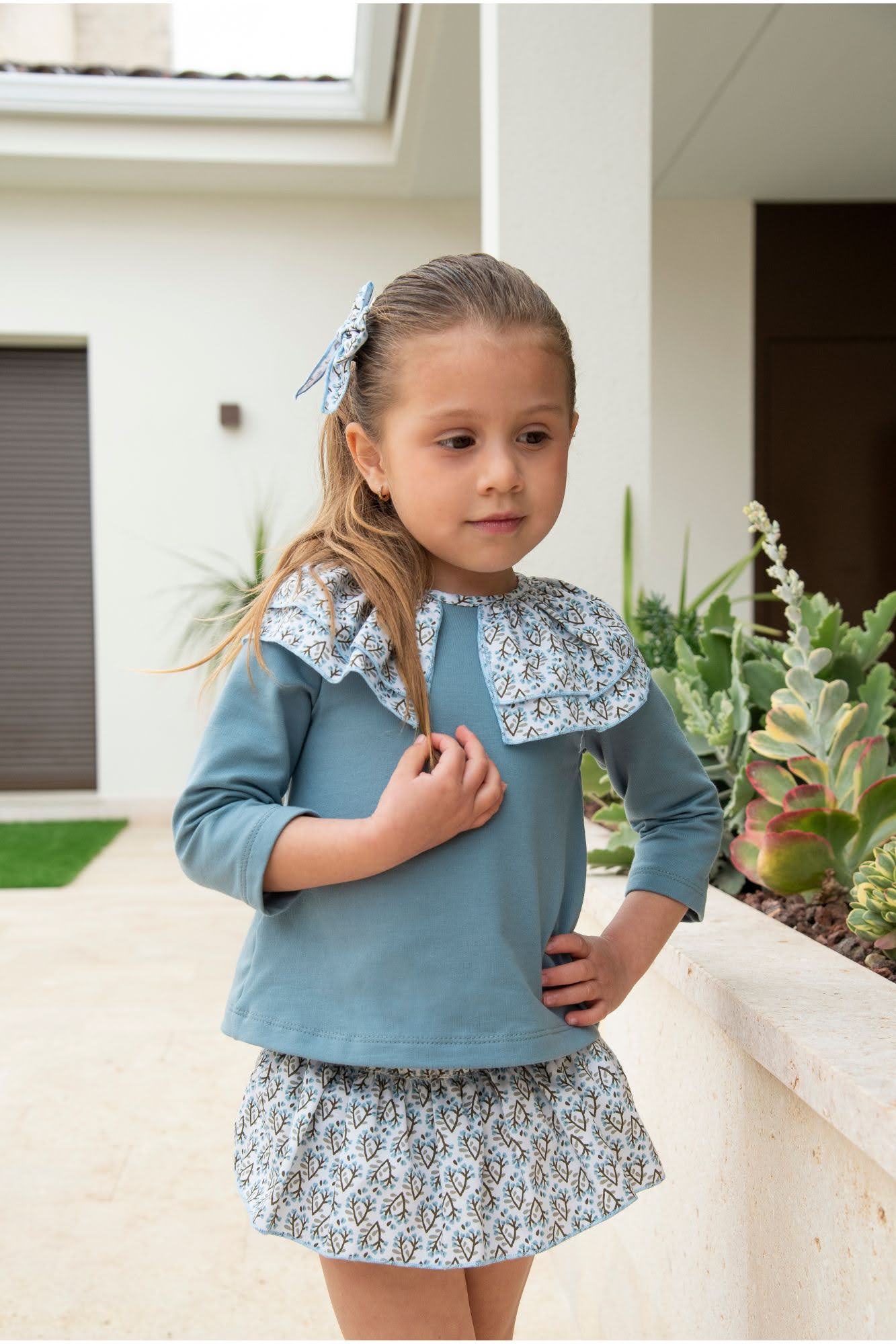 Conjunto de bebé niña de la familia a juego con el de niña mayor. Incluye blusa azul con cuello volante estampado en tonos azul y beige, y faldita con el mismo estampado coordinado. Un look dulce y elegante, ideal para ocasiones especiales o para ir conjuntadas con hermanas.