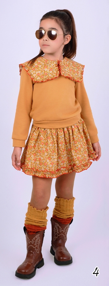 Conjunto para niña de la marca Nekenia, colección otoño invierno. Incluye sudadera en tejido afelpado color ocre, con diseño de cuello cuadrado que aporta un estilo original y moderno. La falda está confeccionada en tejido Liberty ocre con estampado floral, dando un aire elegante y delicado. Un conjunto perfecto para combinar comodidad y estilo en la nueva temporada.