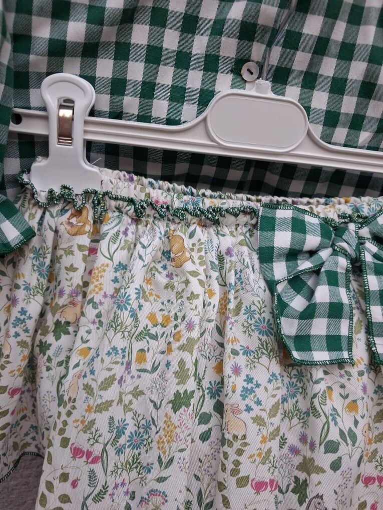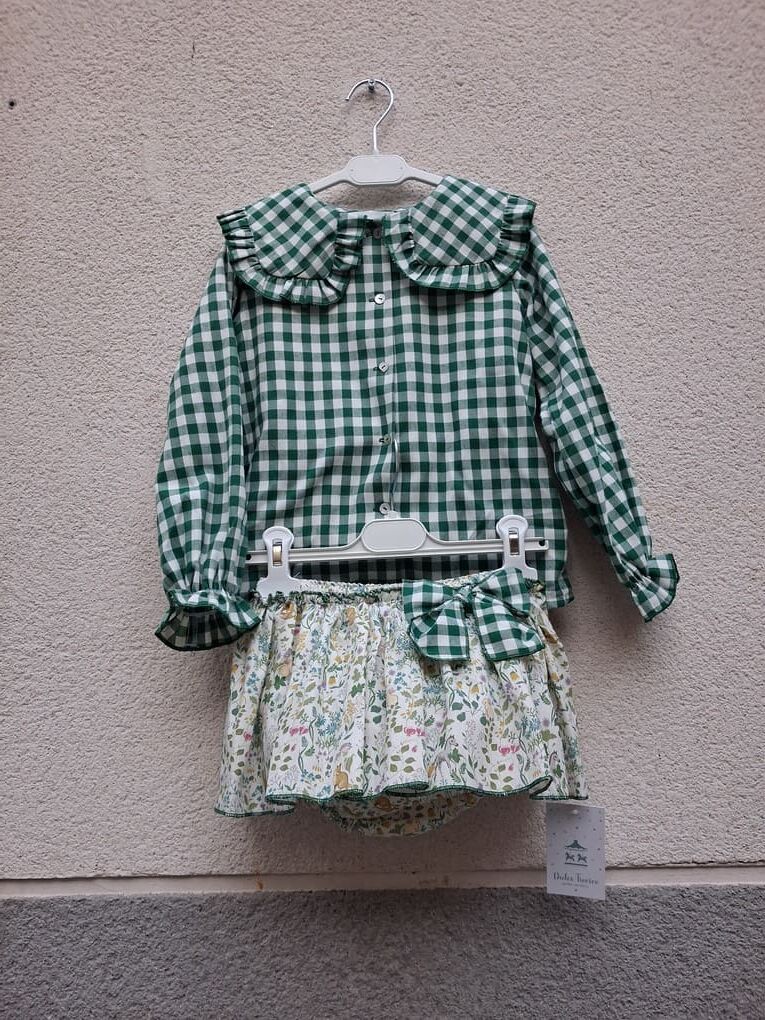 Conjunto Dulce Tiovivo de camisa vichy verde y braga falda con un divertido estampado de animalitos. La combinación perfecta de estilo clásico y comodidad para que tu niña pueda jugar sin parar.