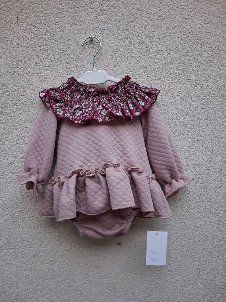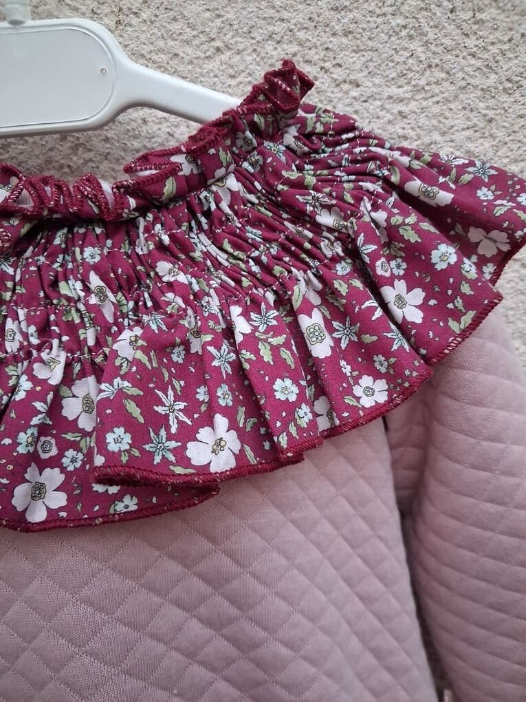 Jesusito confeccionado en suave tejido de chándal o algodón en tono rosa viejo. Presenta un delicado cuello con estampado de flores granates que aporta un toque elegante y original. Una prenda cómoda y dulce, perfecta para el día a día de las más pequeñas.
