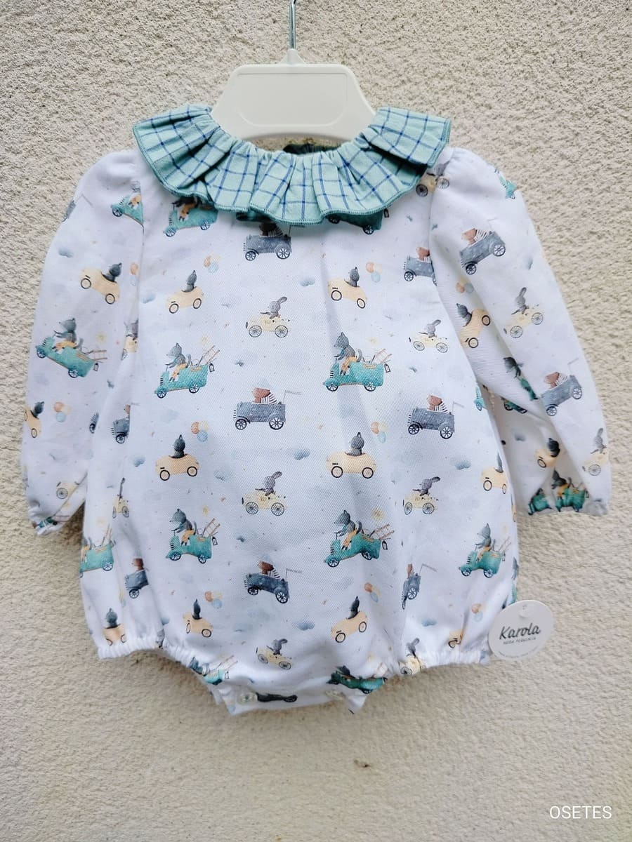 Este encantador pelele de algodón 100% combina comodidad y estilo para los más pequeños. Su base blanca está decorada con un estampado infantil de animalitos conduciendo coches, aportando un aire tierno y divertido.