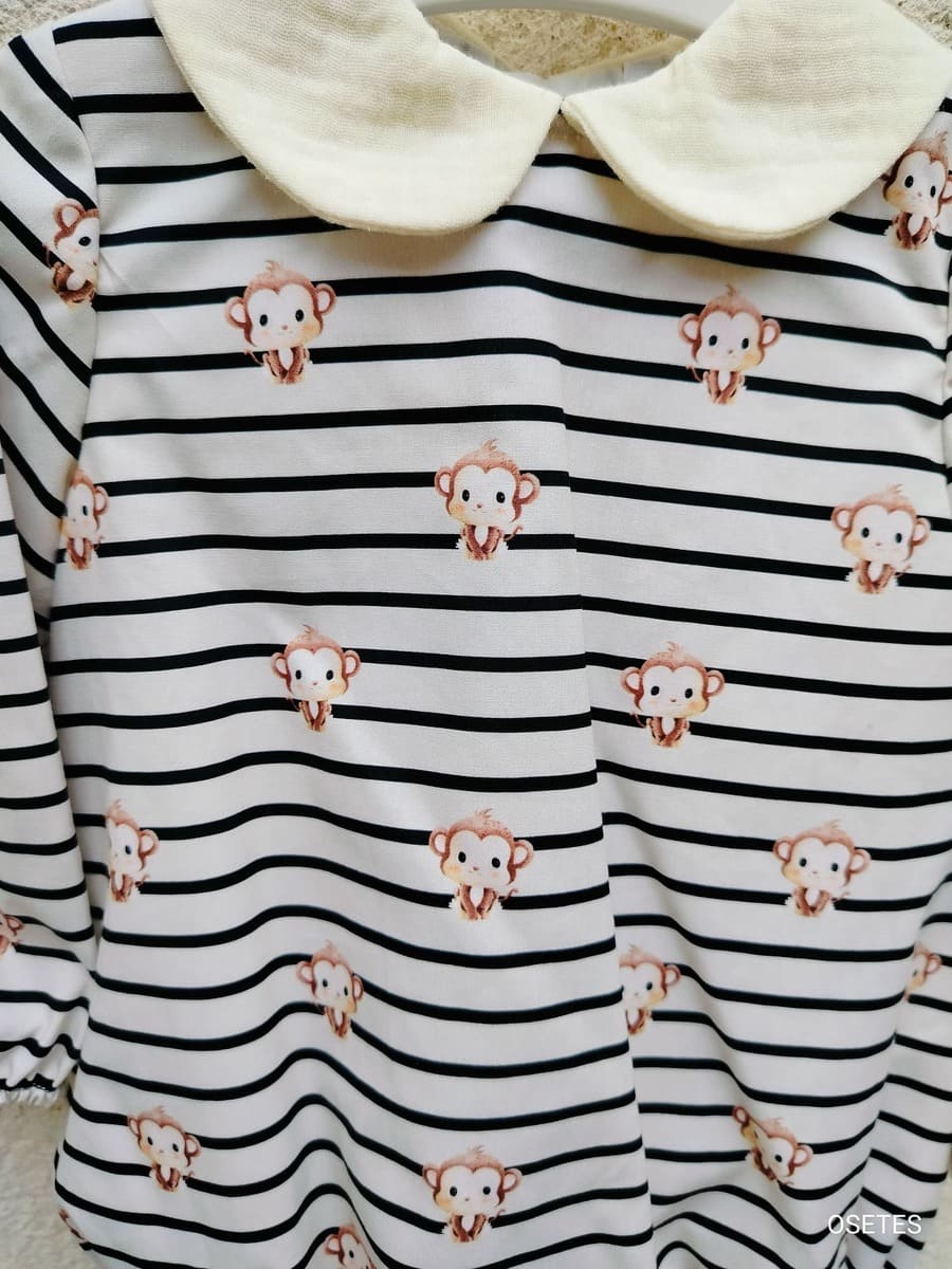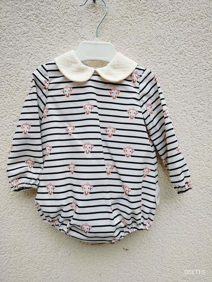 Este pelele de la familia Moni de Karola (by Daniesty) es una prenda cómoda y alegre, ideal para el día a día de tu bebé. Confeccionado en tejido suave y agradable al tacto, destaca por su original estampado a rayas con pequeños monos que aportan un toque divertido y tierno. Su cuello bebé en color blanco le da un aire clásico y muy favorecedor.