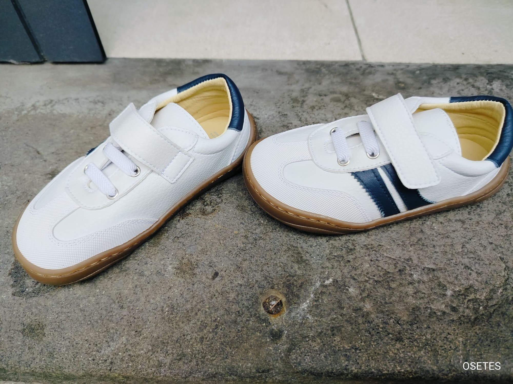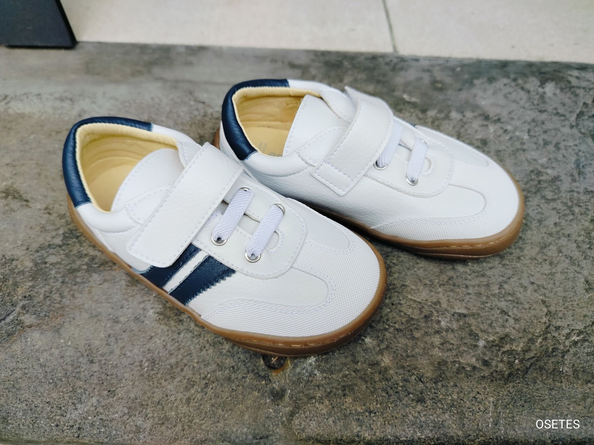 Playeros respetuosos de Andanines en color blanco con detalles en marino, diseñados para acompañar el desarrollo natural del pie de los peques. Con cierre de velcro que facilita el calce y gomas elásticas para mayor sujeción al pie. Suela flexible y fina que permite un movimiento libre y puntera reforzada para resistir el ritmo diario. Un calzado cómodo, ligero y versátil, perfecto para el día a día con estilo.