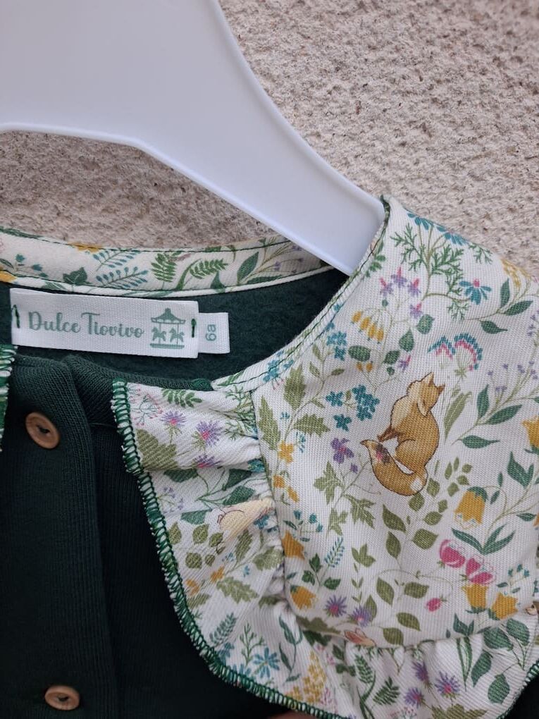 El cuello, con un bonito estampado de animalitos y volantito, tiene un corte original: cuadrado por detrás y en pico por delante. ¡Calidez y un toque muy dulce en una sola prenda!