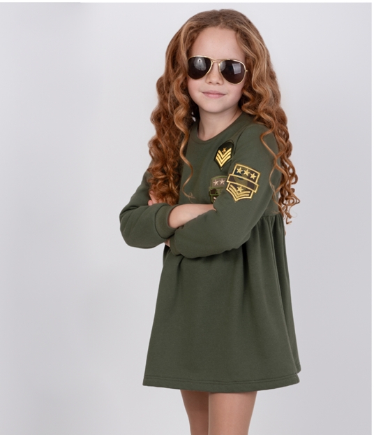 Vestido para niña de la marca Nekenia, colección otoño invierno. Confeccionado en tejido de felpa verde militar, suave y cálido. Destaca por sus parches decorativos en el delantero y la manga, que aportan un estilo moderno y desenfadado. Diseño de manga larga con corte evasé desde el pecho, cómodo y versátil para el día a día.