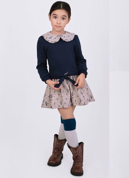 Vestido para niña de la marca Nekenia, colección otoño invierno. Cuerpo en tejido tipo chándal afelpado azul marino, cálido y confortable. La falda en tono beige destaca por su original estampado de pájaros y espantapájaros, aportando un aire único y divertido. Incluye cuello con volante y lazada en la cintura. Una prenda perfecta para vestir cómoda y con estilo en la nueva temporada.