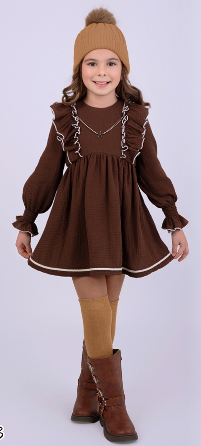 Vestido para niña de la marca Nekenia, colección otoño invierno. Confeccionado en bambula marrón, ligero y con movimiento. Presenta volantes en los hombros y falda con vuelo, que aportan un aire elegante. El cuello está adornado con un detalle tipo collar que lo hace especial y diferente. Una prenda ideal para lucir con estilo en la nueva temporada.